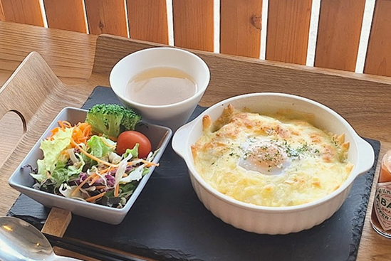 北栄町産のトマトとナスをじっくり煮込んで作ったミートソースとホワイトソース、さらに旨味の強い鹿肉をふんだんに使ったドリア。鹿肉の芳醇な香りがたまらない一皿です。